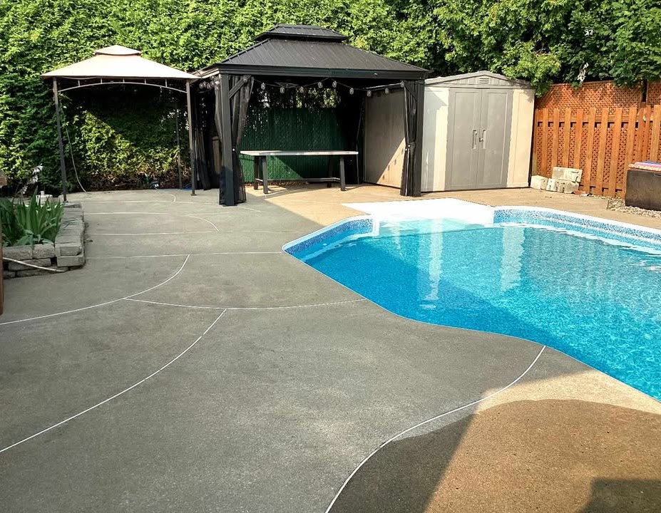 Service : Avant → Surface de béton ternie, traces noires et accumulation de saleté autour de la piscine.